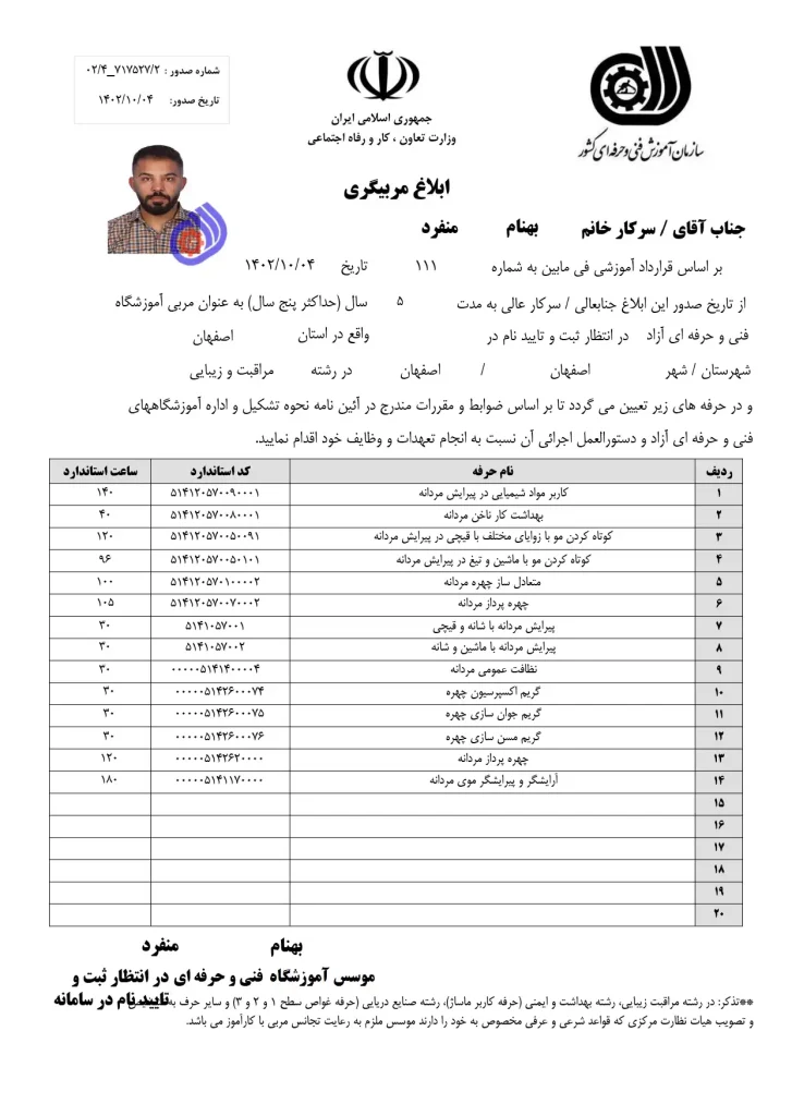 آموزشگاه آرایشگری بهنام منفرد یکی از بهترین مراکز آموزش آرایشگری مردانه در اصفهان است که با بیش از ۱۳ سال سابقه فعالیت حرفهای در این حوزه شناخته میشود. این آموزشگاه با شماره شناسایی 102286 بهعنوان یک آموزشگاه رسمی و معتبر فنی و حرفهای فعالیت میکند. در آموزشگاه آرایشگری بهنام، هنرجویان امکان شرکت در دورههای مقدماتی و پیشرفته آرایشگری مردانه را دارند و پس از پایان دورهها، میتوانند در آزمونهای سازمان فنی و حرفهای شرکت کرده و در صورت قبولی، مدرک فنی و حرفهای درجه دو و درجه یک دریافت کنند. این مدرک قابلیت ترجمه رسمی داشته و از اعتبار لازم برای فعالیت حرفهای در داخل و خارج از کشور برخوردار است. علاقهمندان میتوانند برای کسب اطلاعات بیشتر، بهصورت حضوری به آموزشگاه مراجعه کرده یا از طریق شمارههای درجشده در وبسایت، با آموزشگاه آرایشگری بهنام منفرد در ارتباط باشند.
